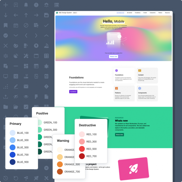 The rollout of the Design System was phased, starting with high-impact features and components. As adoption grew, I expanded the team to 6 contributors. My team has also led multiple company-wide training sessions each year to onboard new team members and guide teams through the system’s capabilities and updates. While my team is not solely dedicated to designing and building the S&C Design System, it is our flagship product.